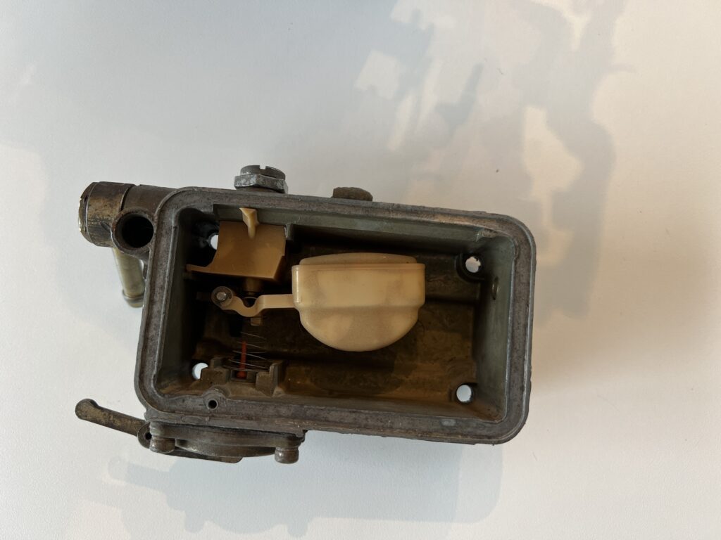 Sådan ser flyderen ud. Benzinen kommer ind og løfter flyderen op. Når flyderen kommer højt nok op, så trykker den på en lille nåleventil og lukker hermed fra strømmen af benzin.