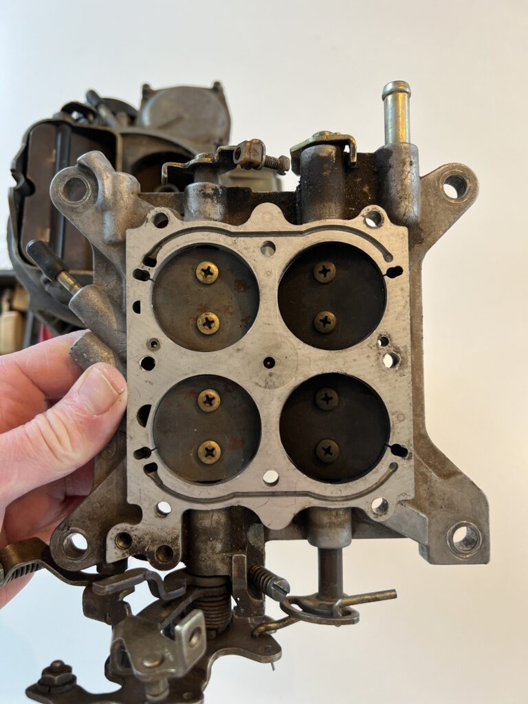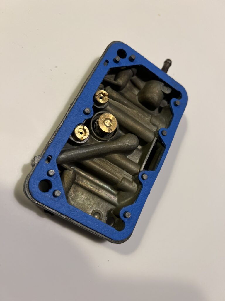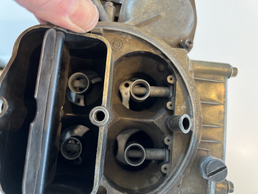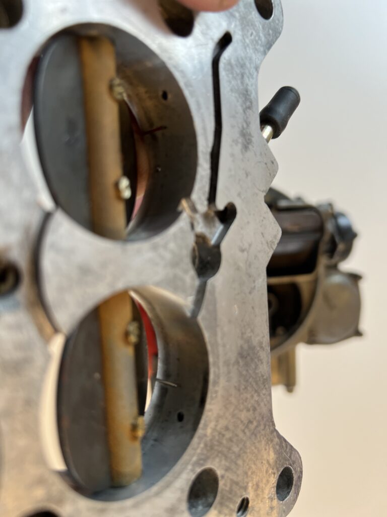 Den lille skrue til venstre nede under det øverste spjæld hedder en acceleratorpumpe. Den kan løsnes og skiftes til en større, eller mindre. Det er her der sprøjtes benzin ud, når man f.eks. træder på speederen første gang efter et lyskryds.