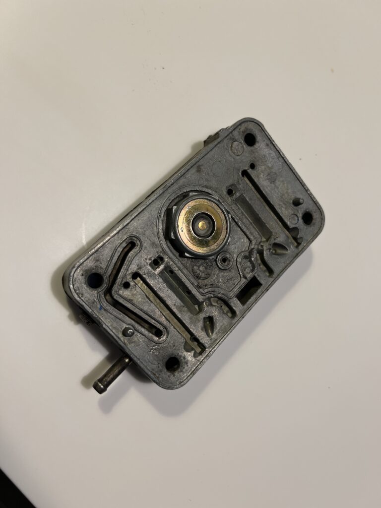 Her ender benzinen så ihuset og du kan se hullet i midten, som er det vakuumkammer som powervalven sidder i og som giver vakuum fra manifolden og dermed åbner / lukker for powervalvens.